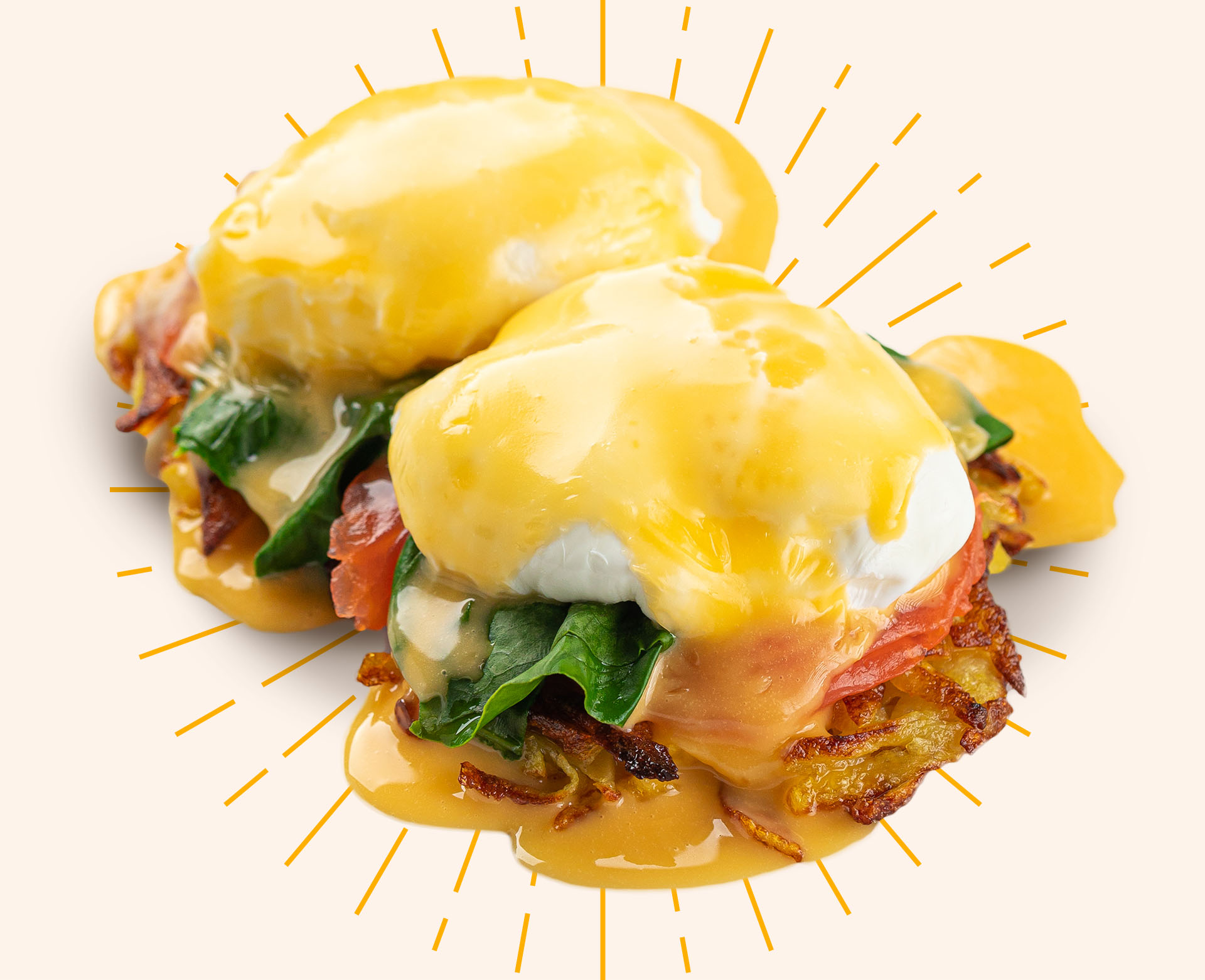 Two poached eggs with spinach, hollandaise sauce & tomato with homefries.